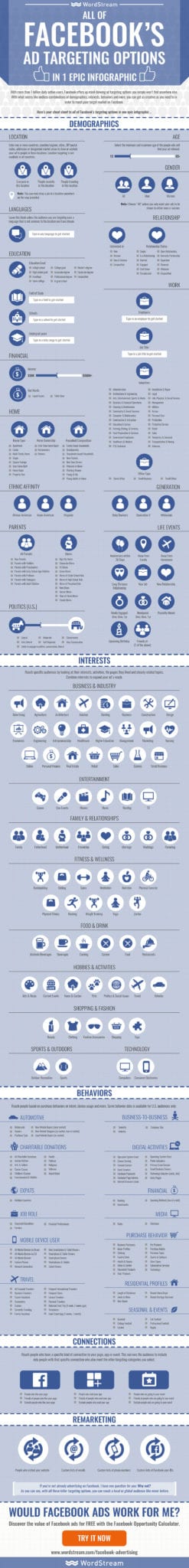 Mungkin Anda belum belum terhadap 10 pilihan targeting yang kami jelaskan di atas. Untuk itu kami telah mempersiapkan sebuah infographic yang kami dapatkan dari WordStream yang membahas secara menyeluruh tentang targeting Facebook Ads ini.