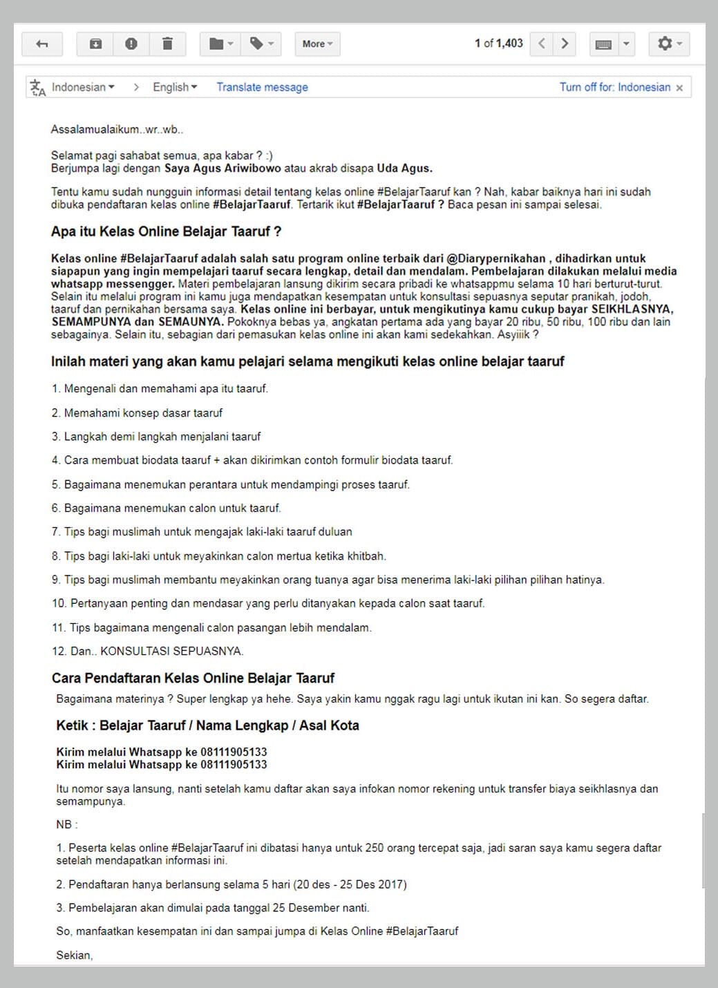 Pada COMEL – Contoh Email Edisi ke 3 ini akan membahas broadcast email dari seorang penulis buku tentang pernikahan.