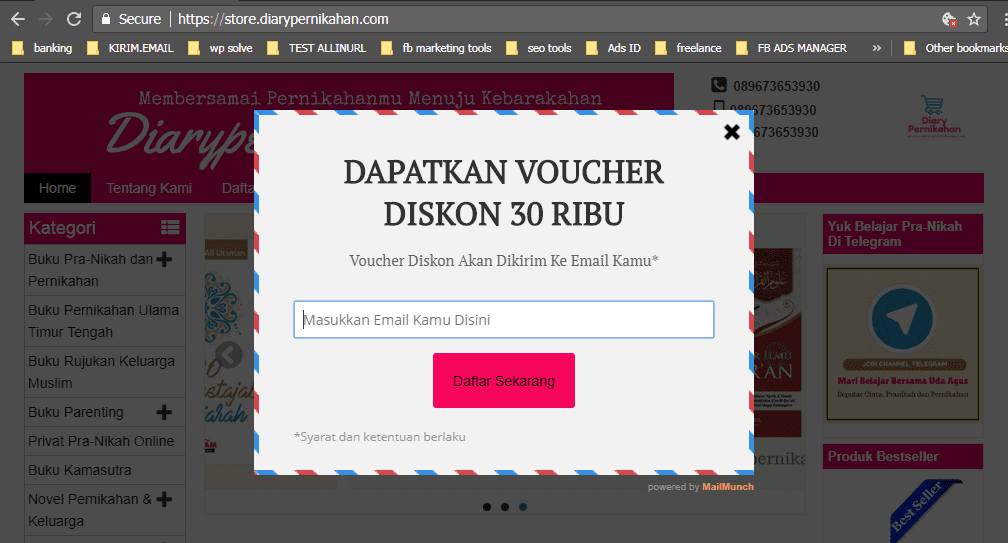 Anda bisa mendapatkan broadcast email dari Pak Agus Ariwibowo secara rutin sekaligus mendapatkan voucher sebesar Rp. 30.000 dengan mendaftarkan email Anda di https://store.diarypernikahan.com :