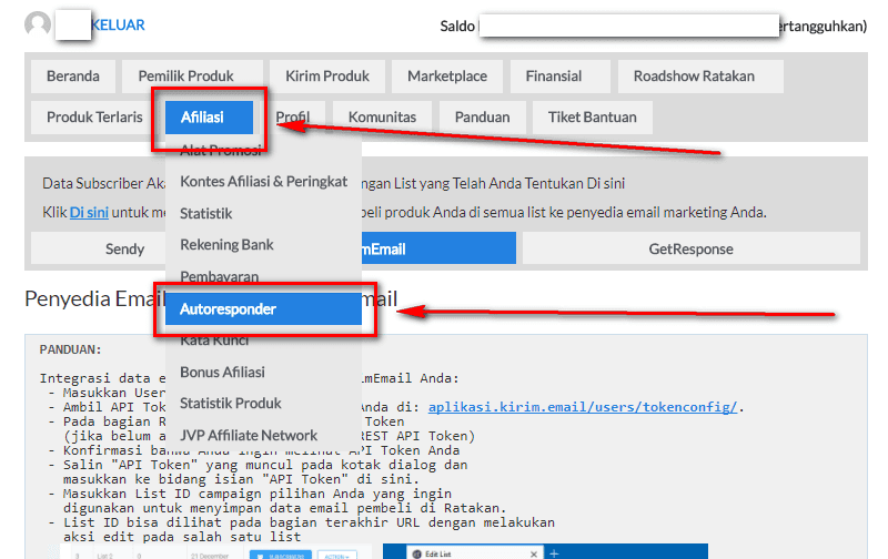 - Pada menu Affiliasi, klik sub menu Autoresponder