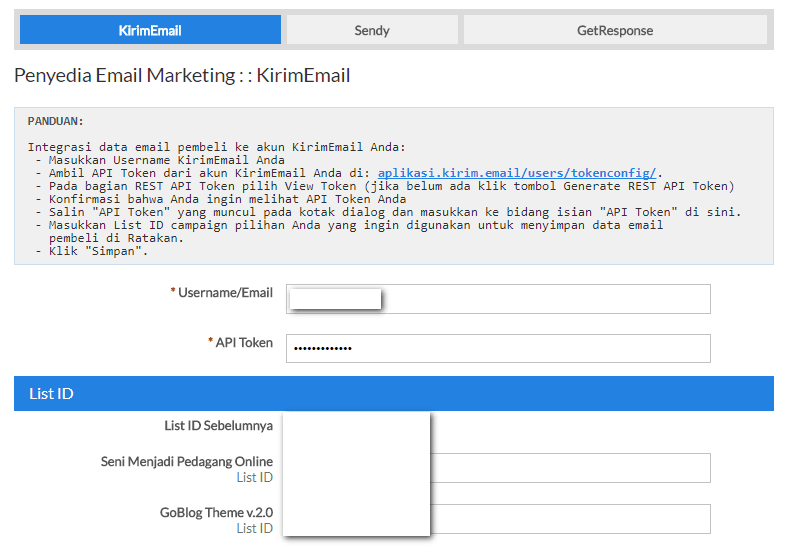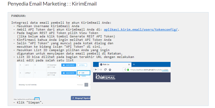 Untuk tutorial bagaimana cara mendapatkan tokennya silakan klik link berikut ini : https://kirim.email/tutorial-mendapatkan-token/ - Pada bagian LIST ID bisa Anda dapatkan dengan melihat bagian terakhir dari URL dengan mengedit pada salah satu list. Setelah itu copy list id nya dan masukkan pada LIST ID field yag tersedia di halaman admin.